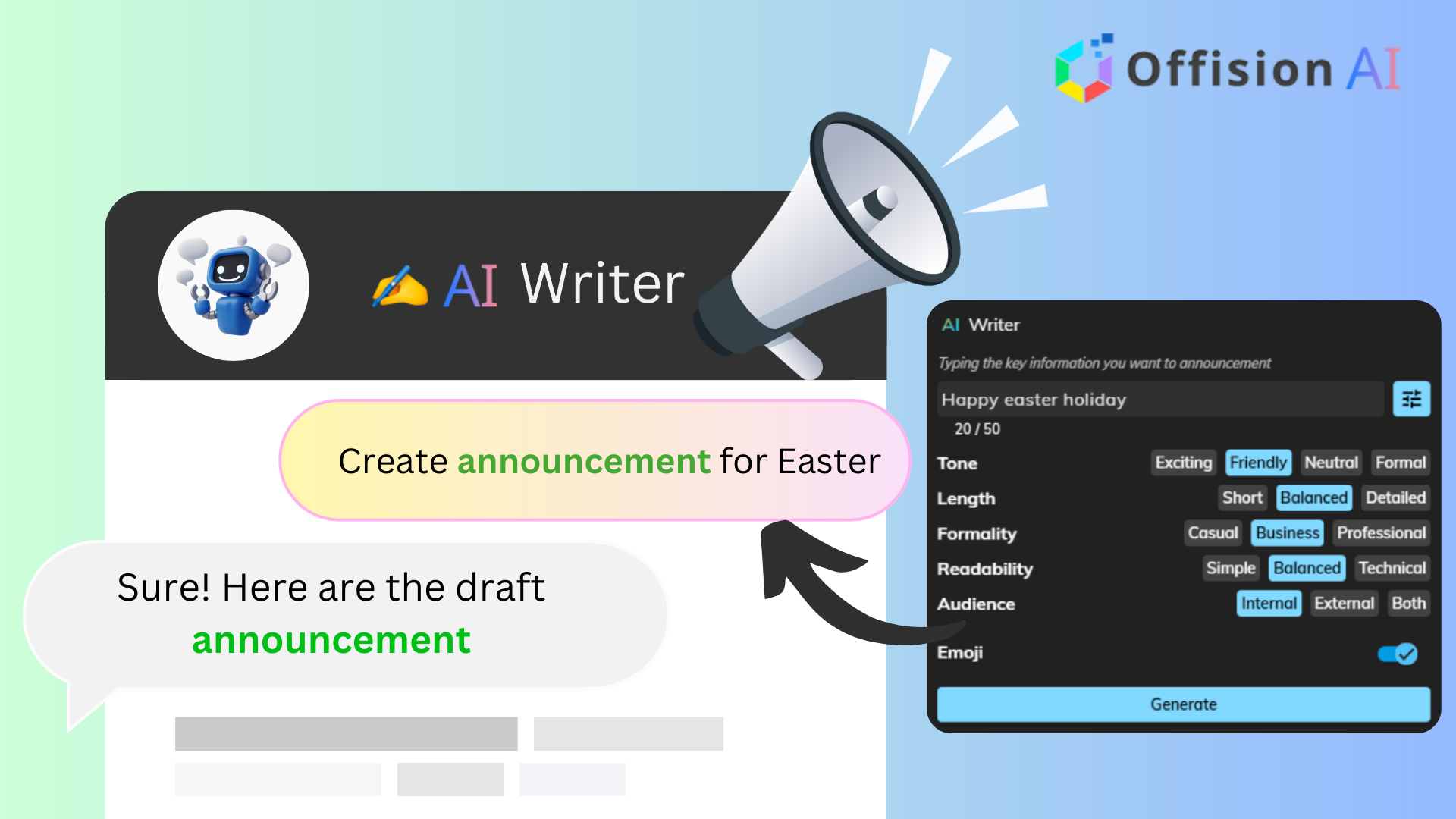 無論您是為內部團隊、客戶還是公眾受眾製作公告,Offision 的 AI Assistant Writer 都能簡化流程並每次都能提供高質量的結果。