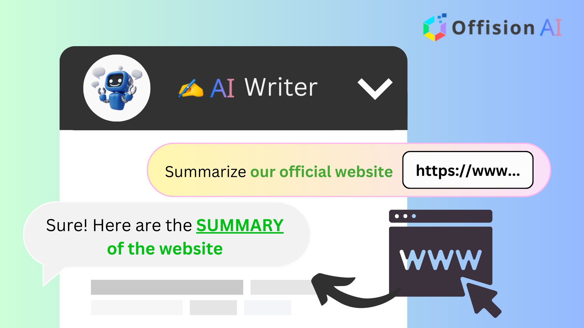 使用 Offision 的 AI Assistant Writer,總結網站內容從未如此簡單。此功能簡化了工作流程,增強了溝通,並使用戶能夠最大限度地提高工作效率 – 只需按兩下即可完成所有作。